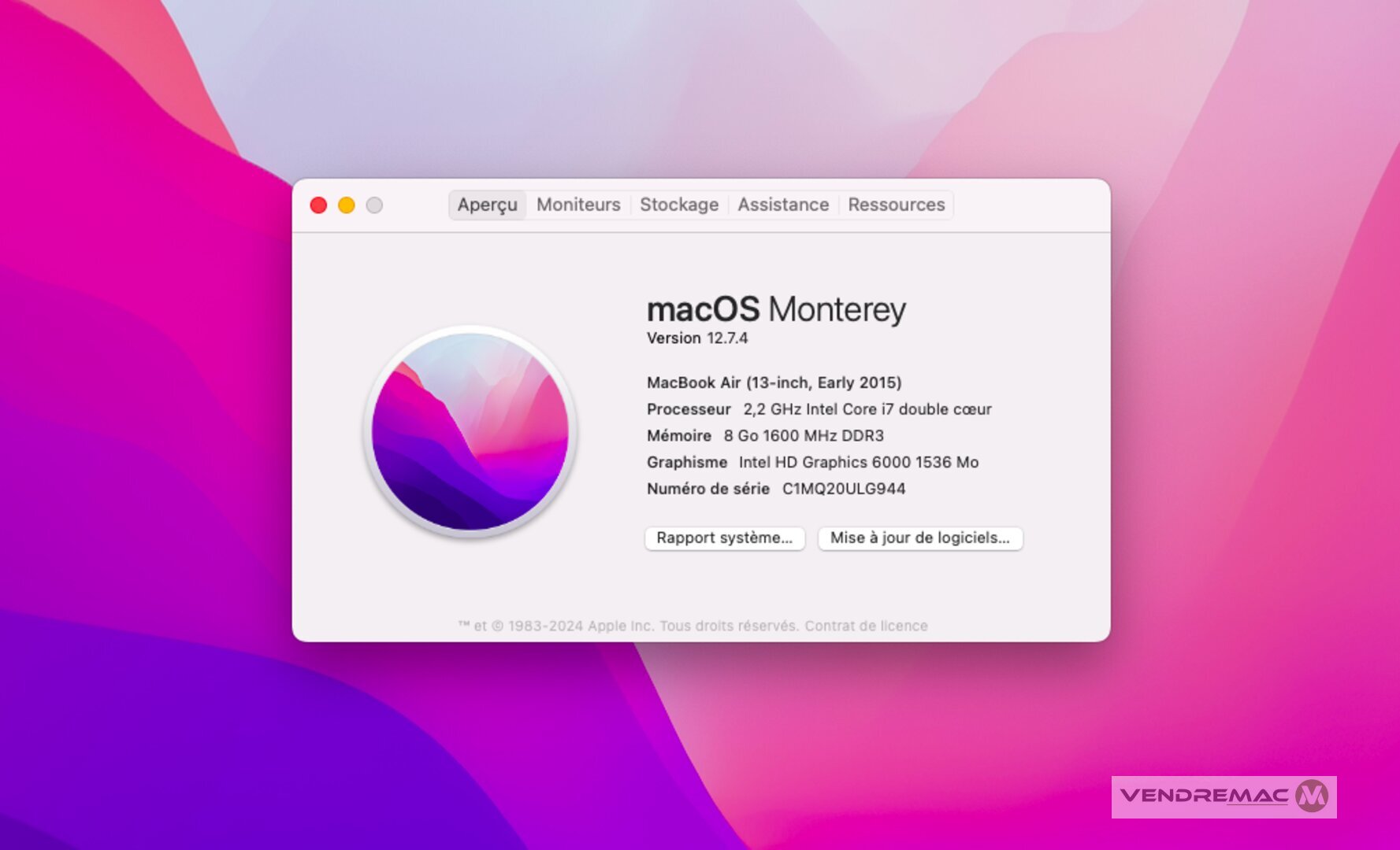 - MacOS Monterey, compatible aussi avec des versions antérieures. Possible d'installer Ventura, Sonoma, Sequoia ou Tahoe via OpenCore.