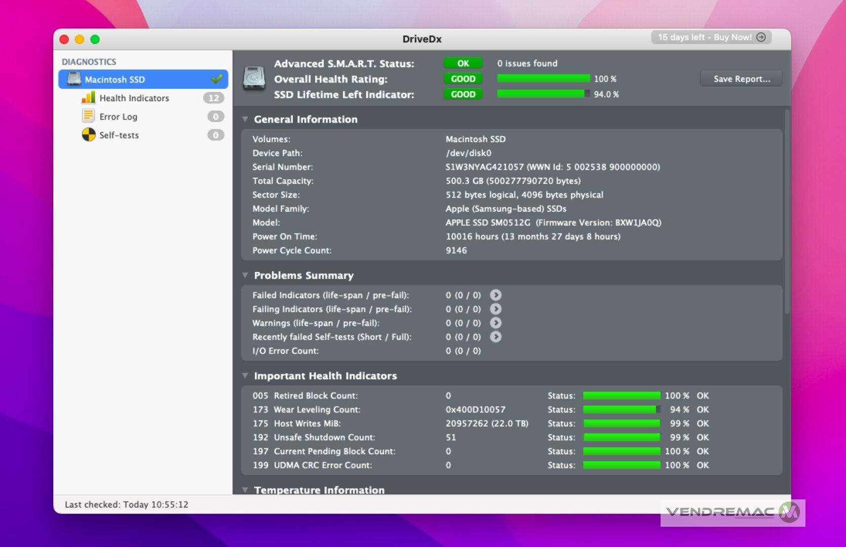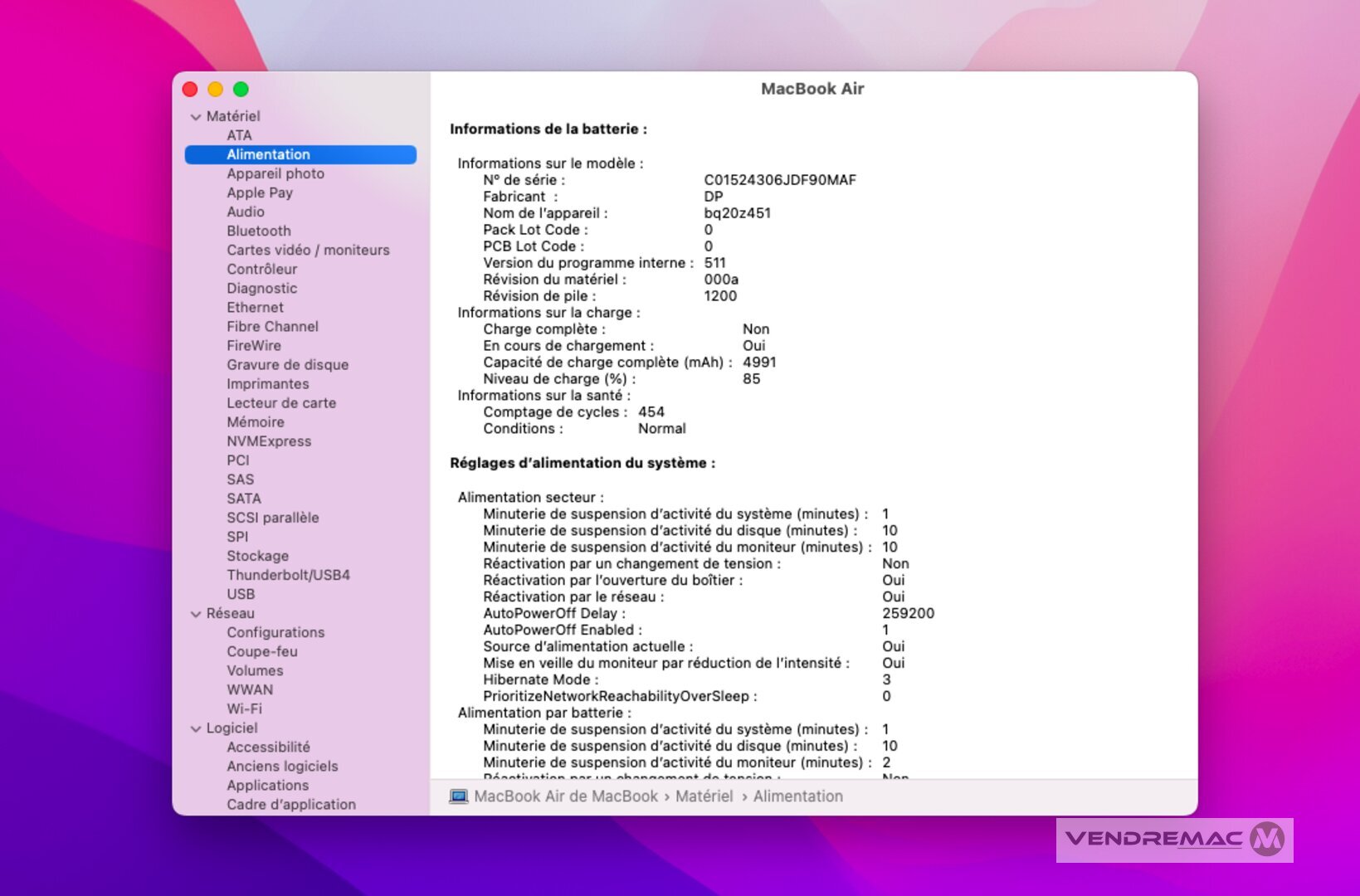- 512 GB de stockage SSD, à 100% de santé et 94% de vie utile, 13 mois et 27 jours d'utilisation cumulée, vitesses jusqu'à 1500 MB/s.