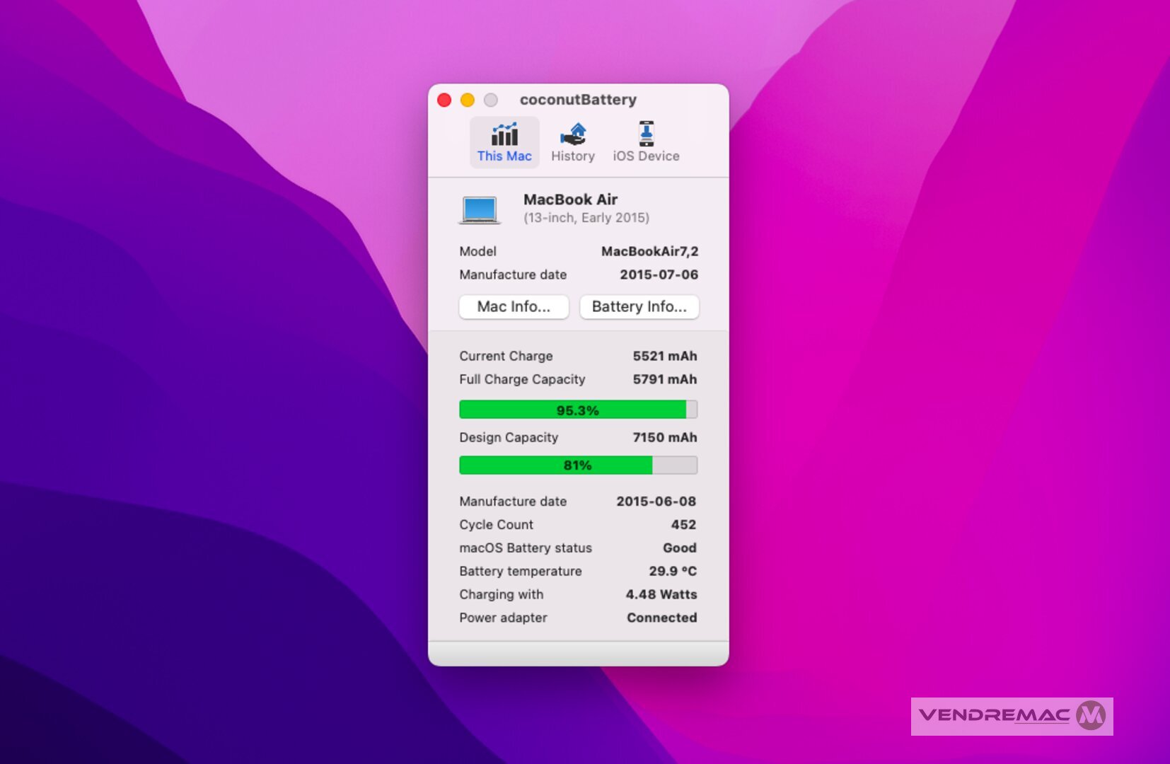 - Batterie d'origine à 81% de force, pour 452 cycles de charge / utilisation.
