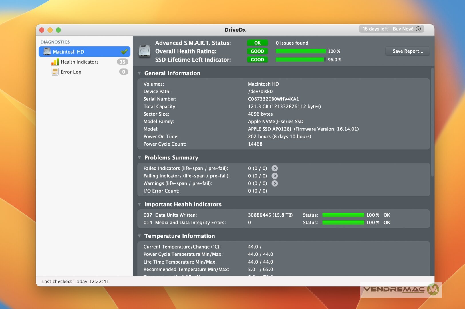 - 128 GB de stockage SSD, à 100% de santé et 96% de vie utile, 8 jours d'utilisation cumulée, vitesses jusqu'à 2500 MB/s.