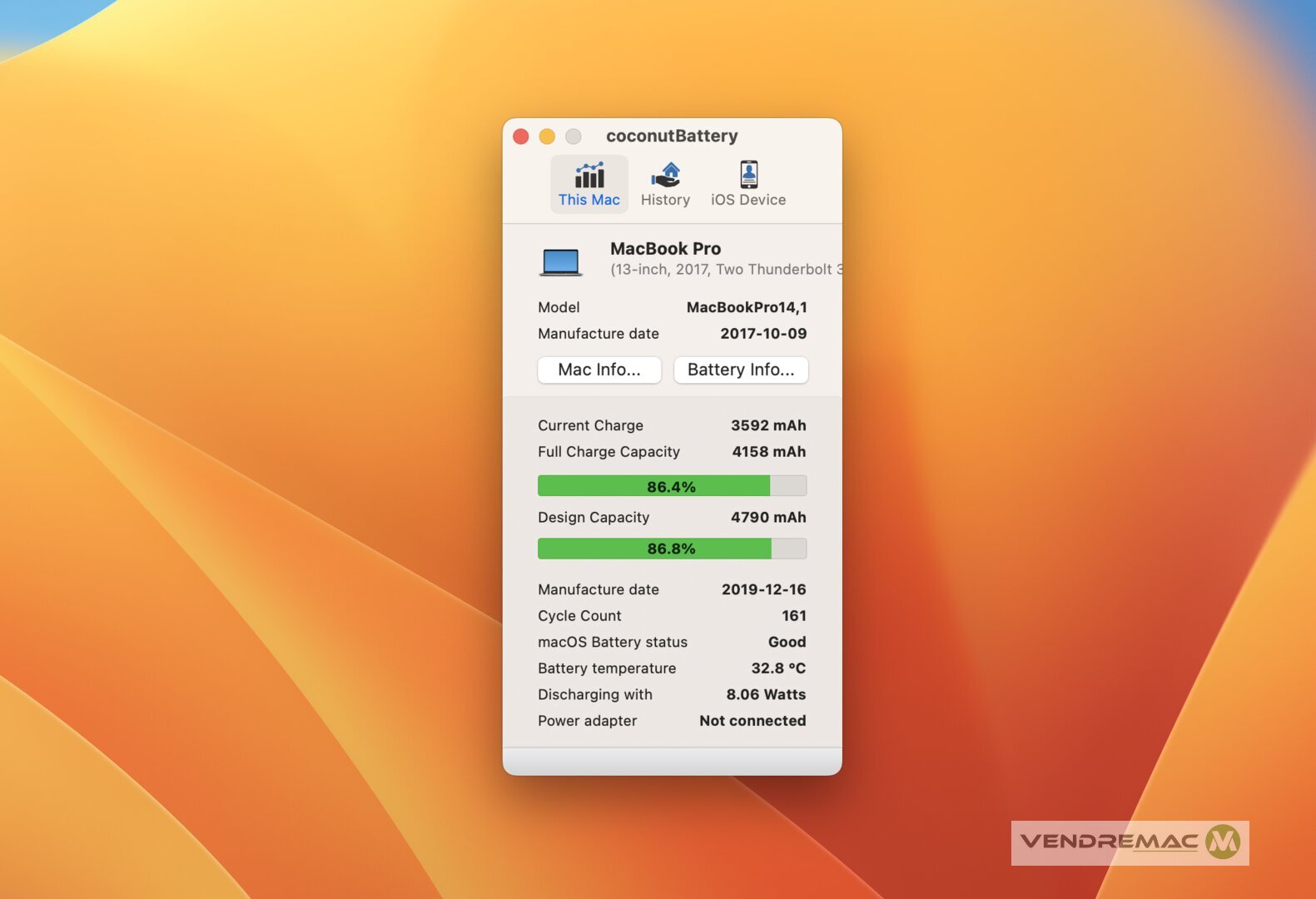 - Batterie à 87% de force, avec seulement 161 cycles de charge / utilisation.