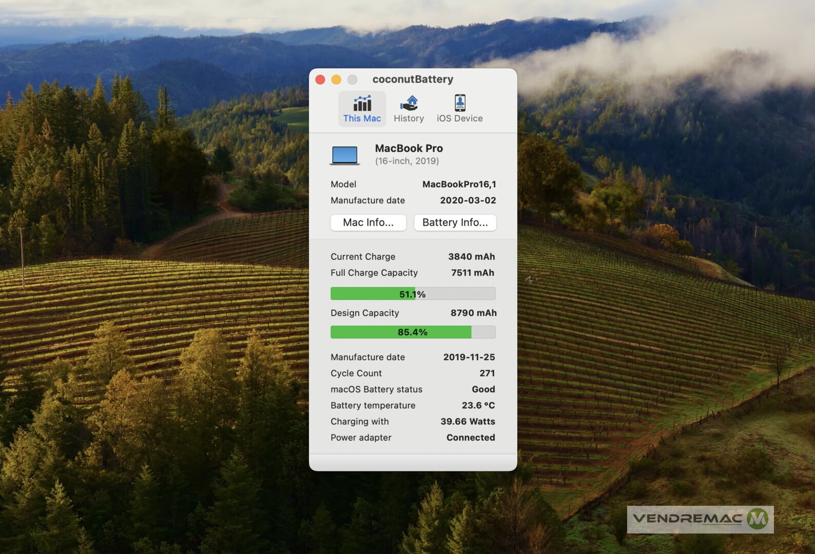 - Batterie à 85% de force, pour seulement 271 cycles de charge / utilisation.