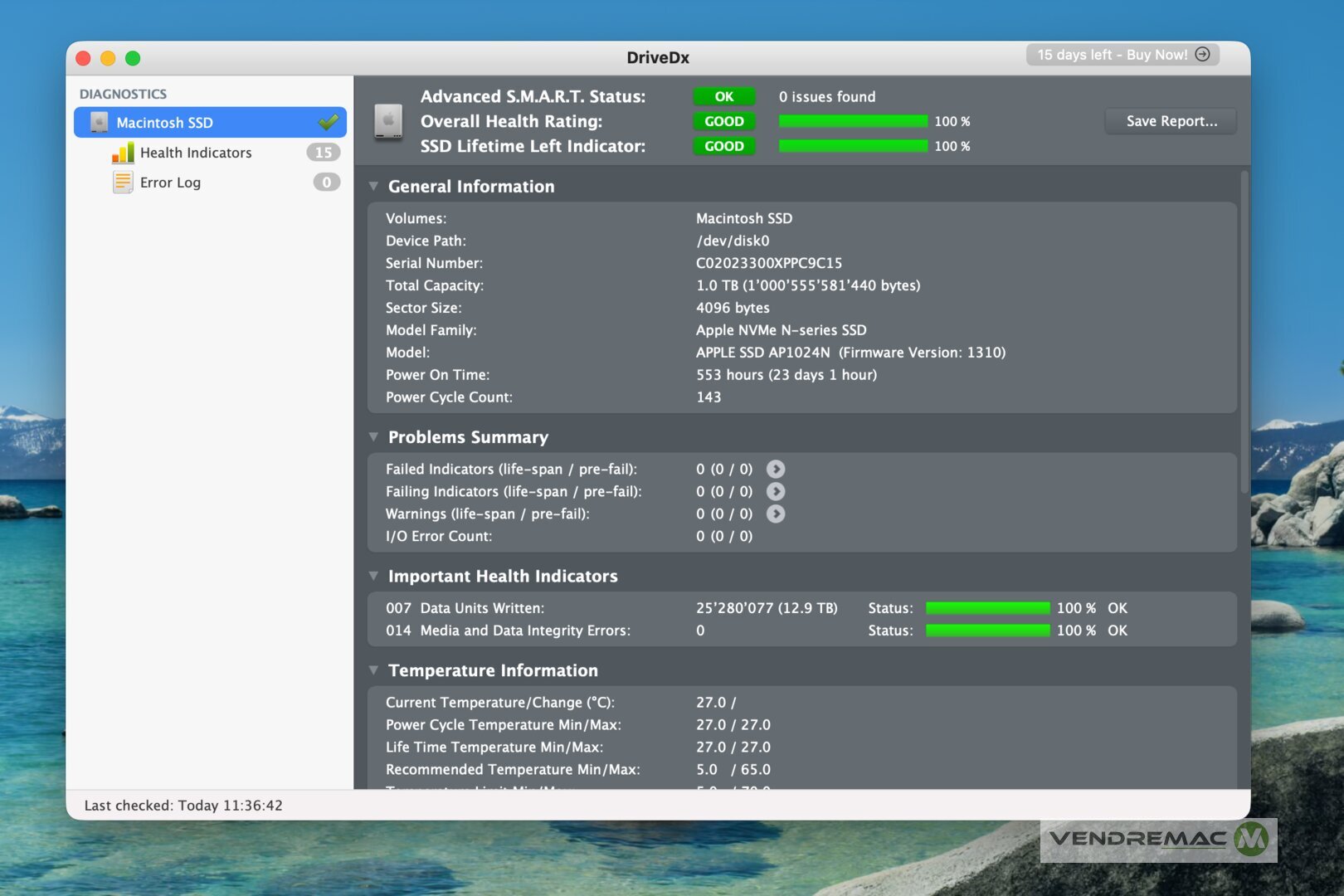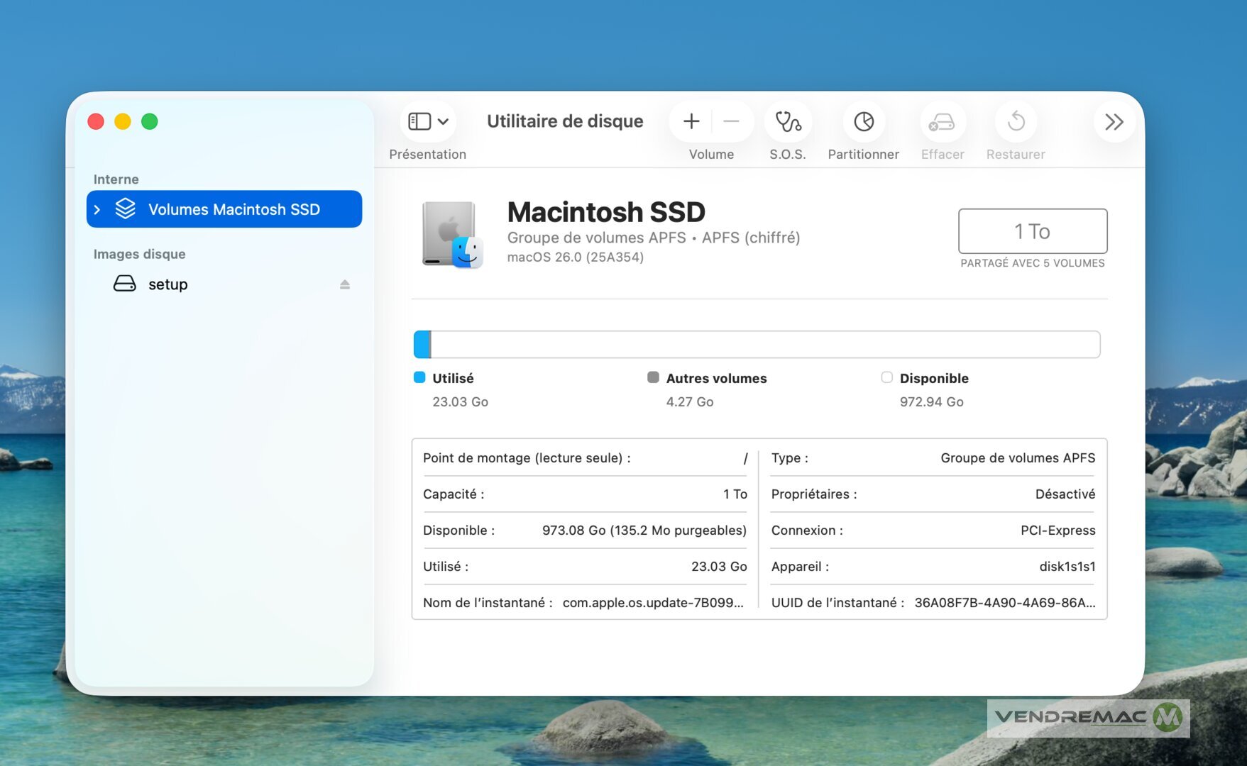 - 1 TB de stockage SSD, à 100% de santé et de vie utile, seulement 23 jours d'utilisation cumulée, vitesses jusqu'à 2500 MB/s.