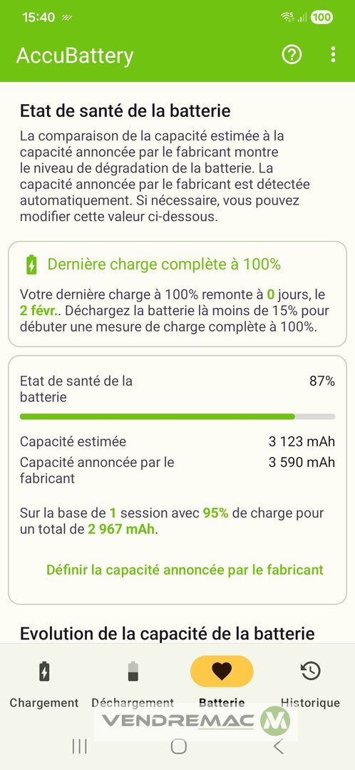 La batterie est en très bon état à 87% de force minimum.