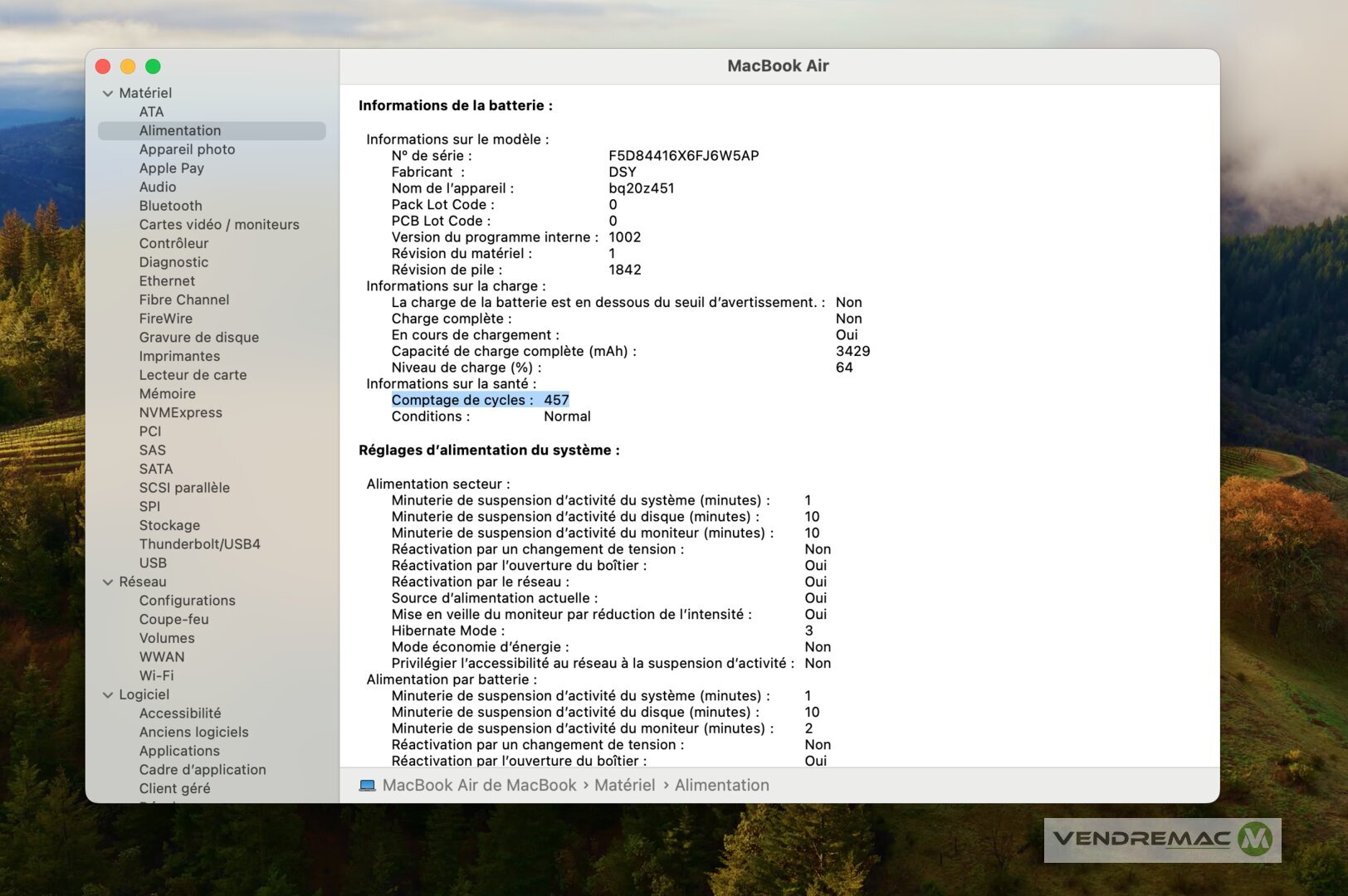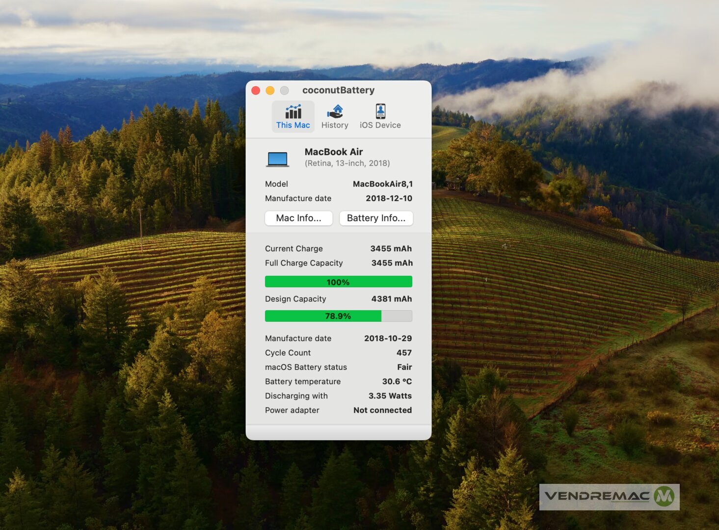 - Batterie à 79% de force, pour 457 cycles de charge / utilisation.