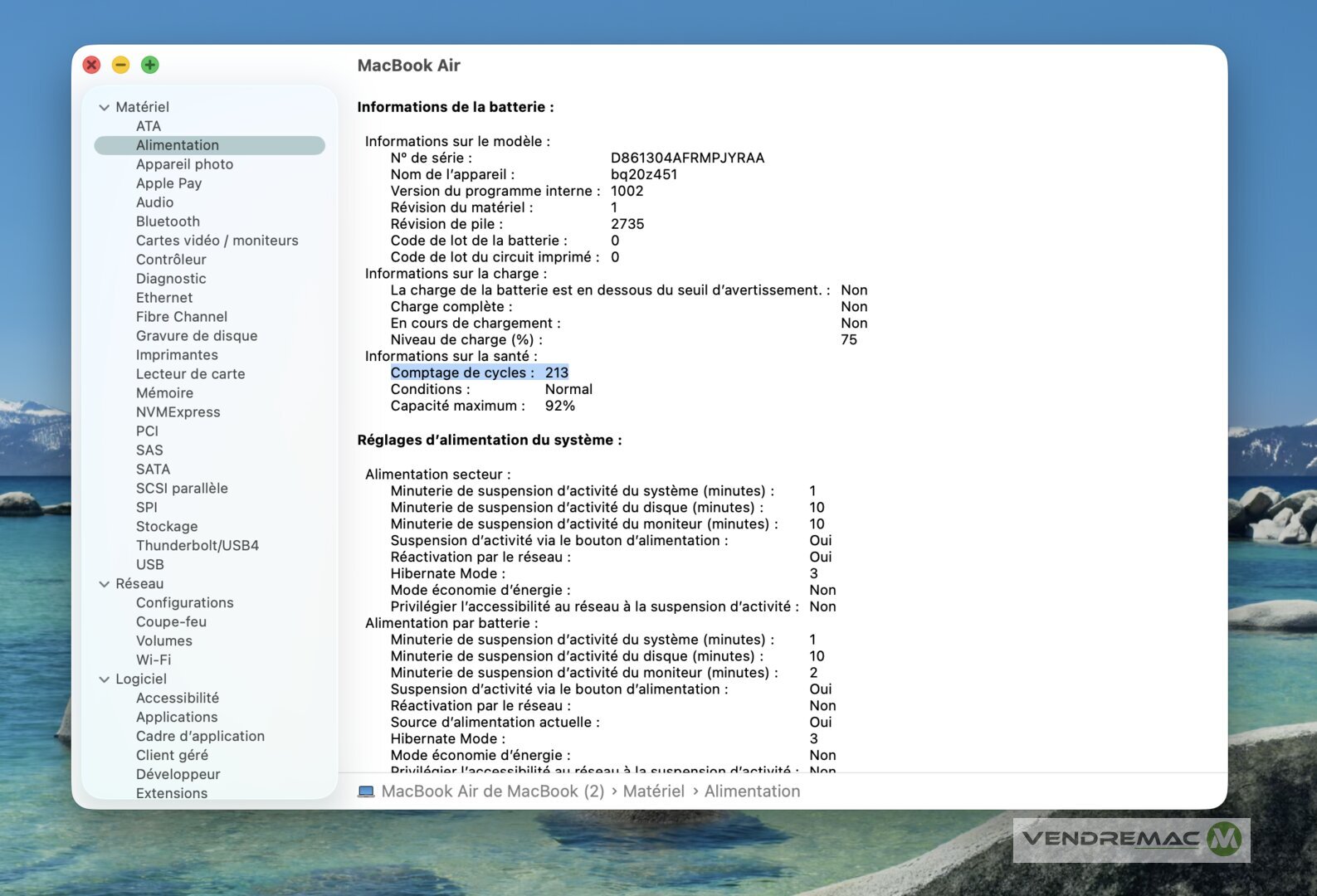 - Batterie à 92% de force, pour seulement 203 cycles de charge / utilisation.