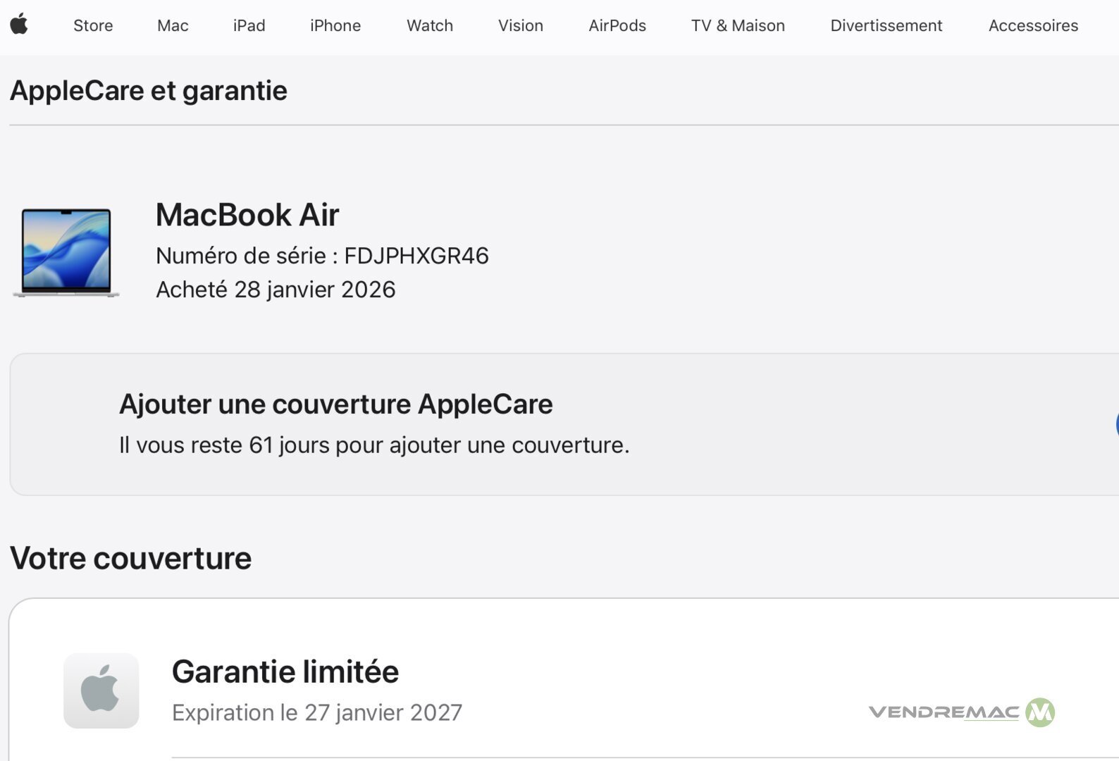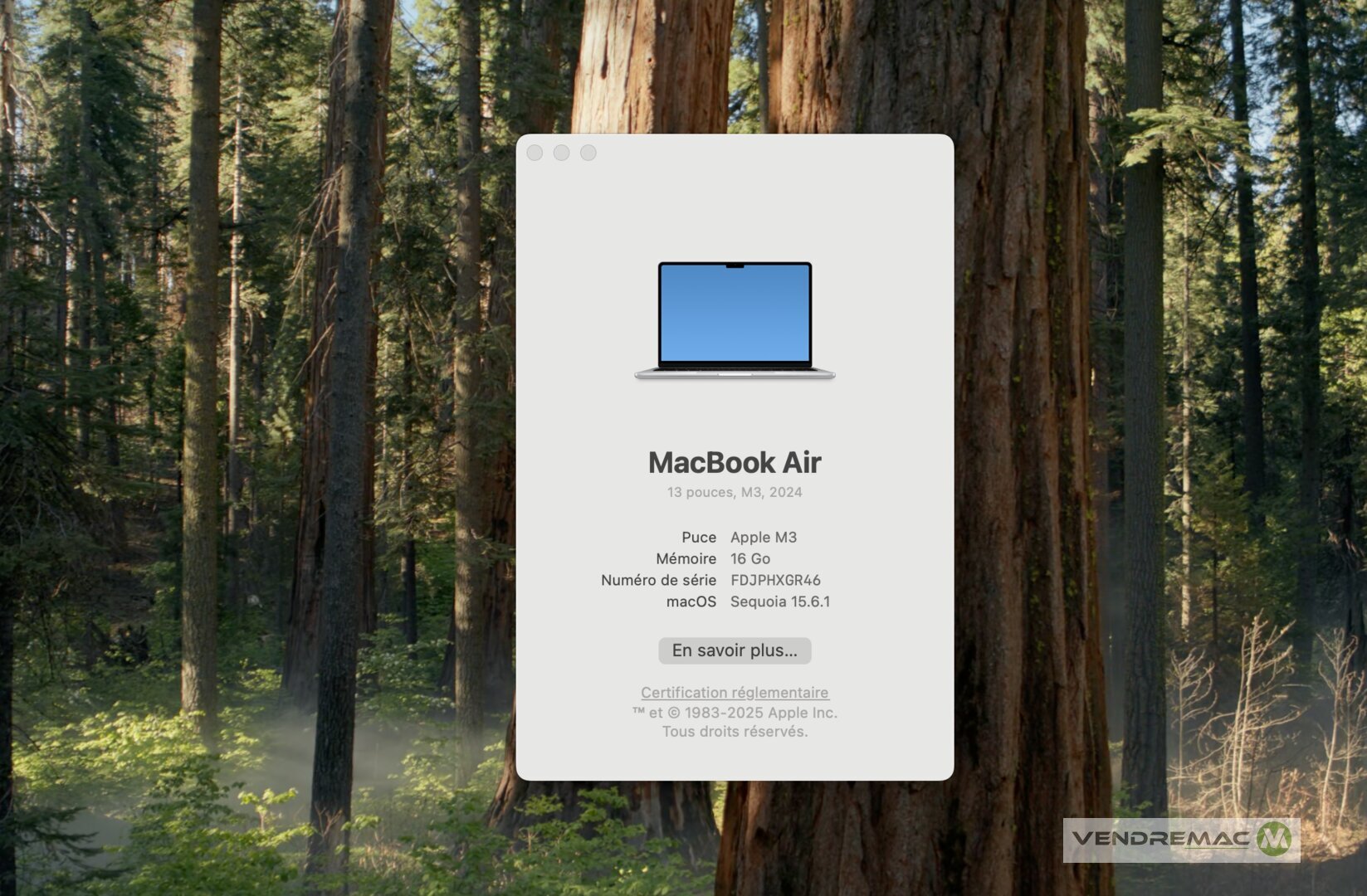APPLE MacBook Air M3 13 2024 2026/ M3 8C CPU 10C GPU / 16GB/ 512GB/ Etat Neuf